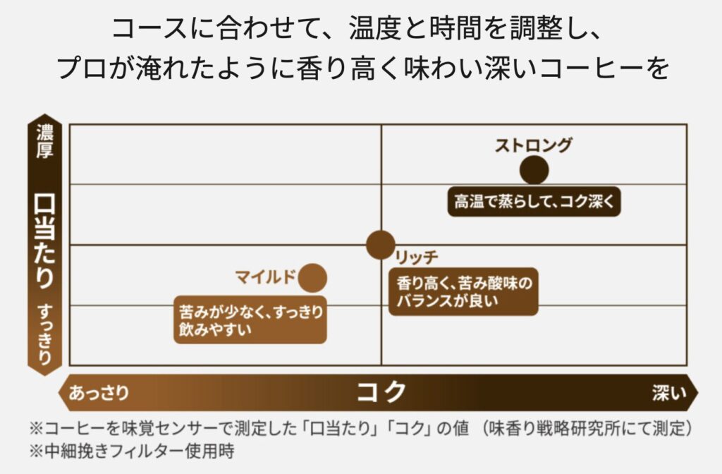 2種類のフィルターで豆を「挽き分け」でき、リッチ・マイルド・ストロングコースでの「淹(い)れ分け」と「挽き分け」の組み合わせで、好みに応じた6種類のコーヒーがたのしめます