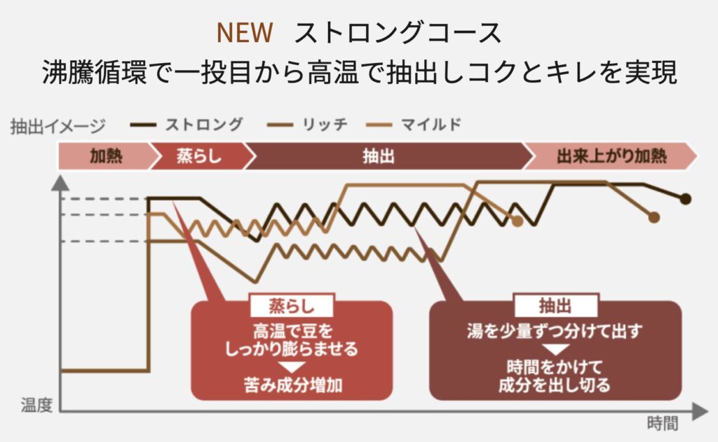 新たに搭載されたストロングコースでは、香りとコク際立つコーヒーが味わえますよ