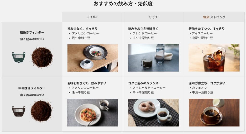 - 6つの味わいコース:リッチ/マイルド/ストロング × 粗挽き/中細