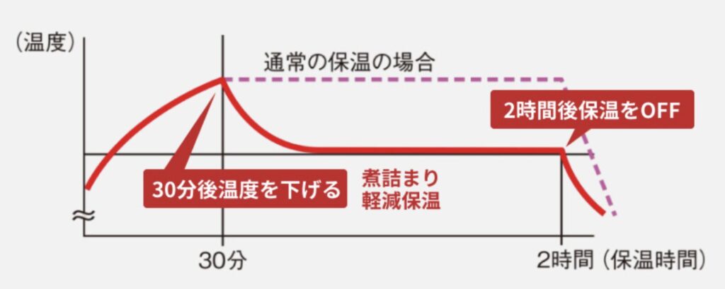 保温開始から30分後に設定温度を下げ、2時間後には保温が切れます(煮詰まりを軽減するため)