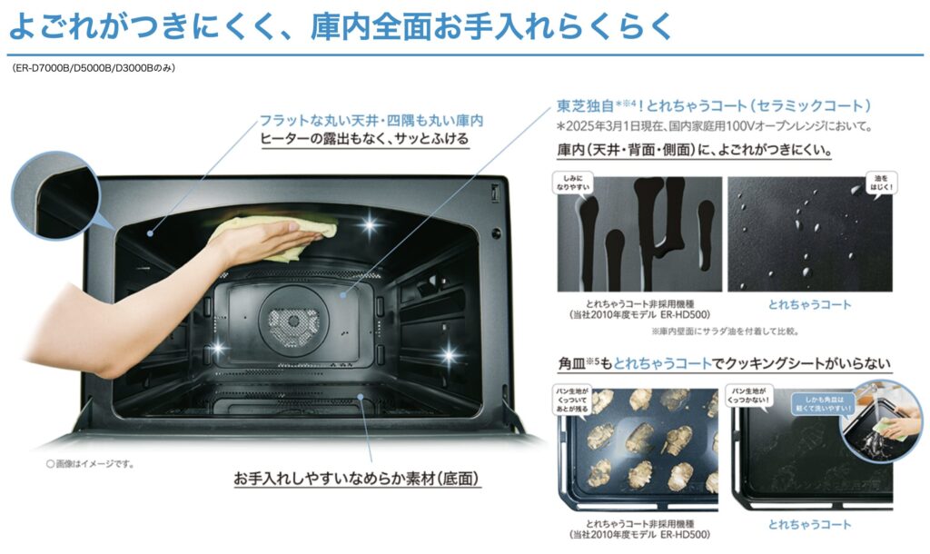 東芝ER-D80Aには、東芝独自の「とれちゃうコート(セラミックコート)」で庫内に汚れがつきにくい。角皿も「とれちゃうコート」でクッキングシートがいりません!