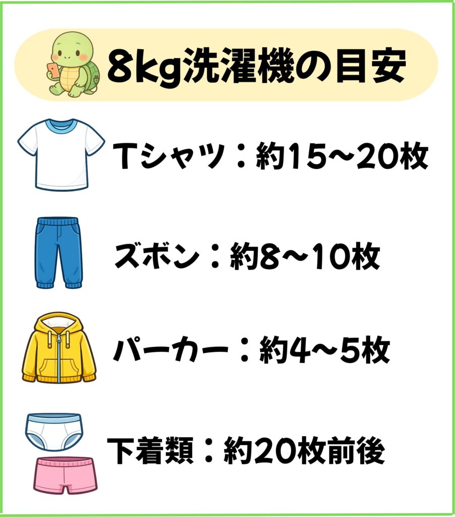 8キロの洗濯機で洗える量を、わかりやすくまとめると次のとおりです。