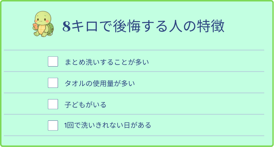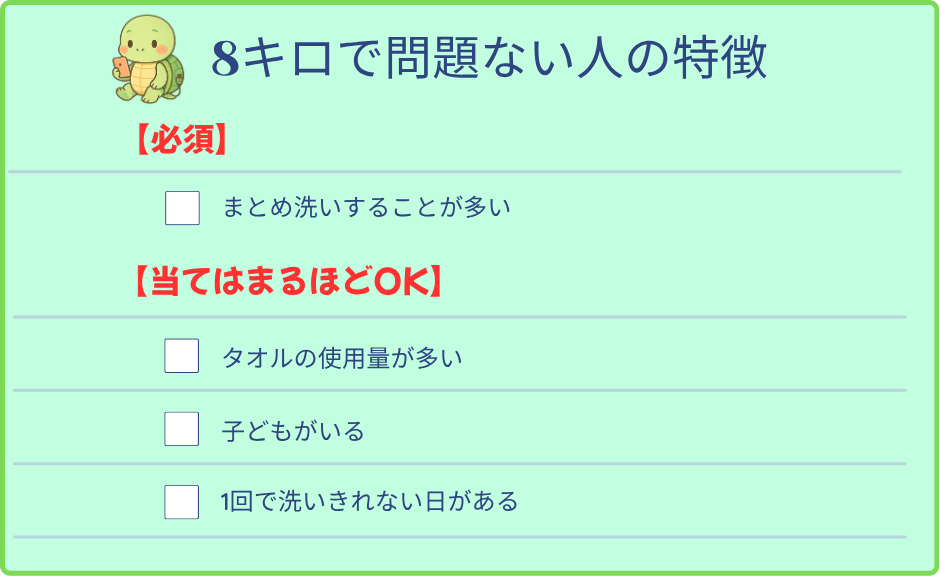 👉 【必須】に当てはまり、さらに2つ以上該当する場合は、8キロでも問題なく使える可能性が高いです!