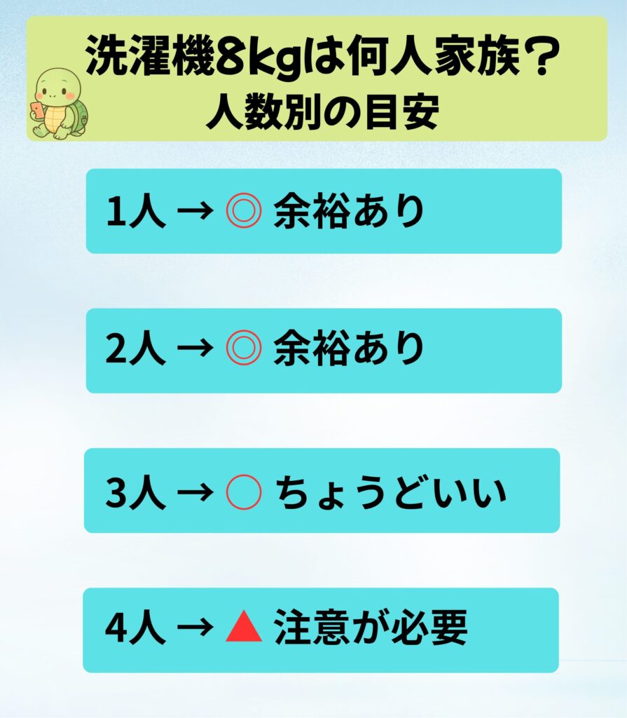 洗濯機8キロは何人家族に向いているのかをわかりやすく整理すると、次のとおりです。