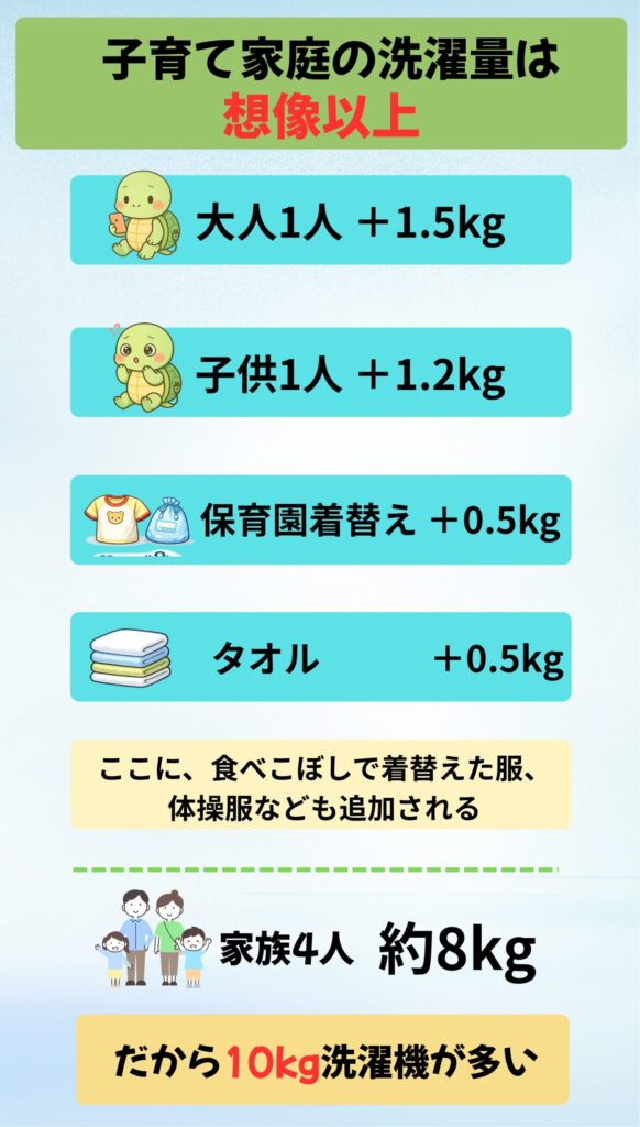 でも、子育て家庭だと洗濯物が増えるから、少し余裕を持った容量を選ぶことが後悔しないポイントになるんです。