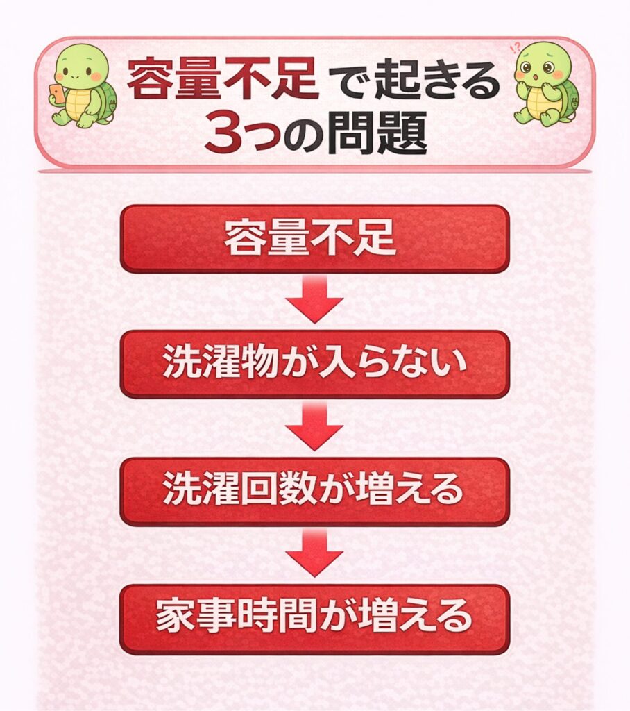 このように、容量不足は洗濯の手間を大きく増やしてしまうんです。