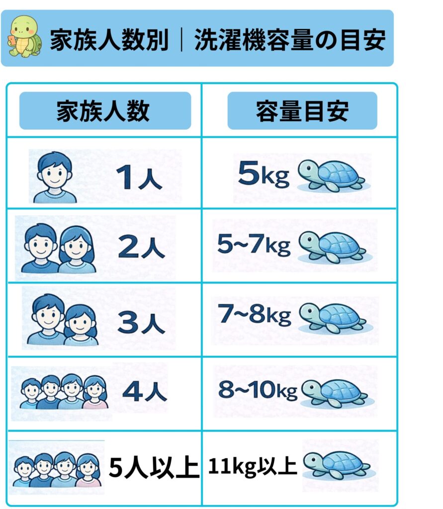 この計算をもとにすると、家族人数ごとの洗濯機容量の目安は次のようになります。