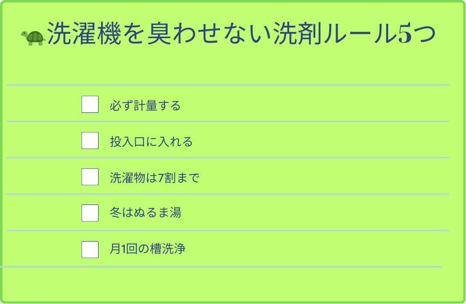 洗剤の入れすぎは臭いとカビの最大原因です。正しい量は商品表示の規定量、それだけで洗濯機の臭いの多くは改善します。